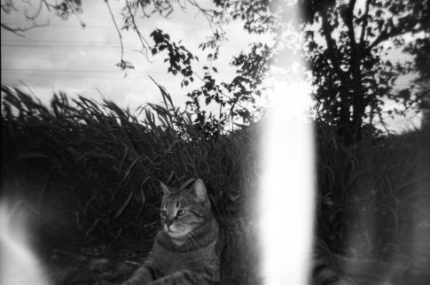 The cat decided to rest in the shade of the young trees. His mind is clear, and a light breeze blows over his mortal body.
