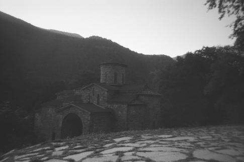 This image shows an 11th-century Alanian church located in the mountains of the North Caucasus. The Karachay-Cherkess Republic.