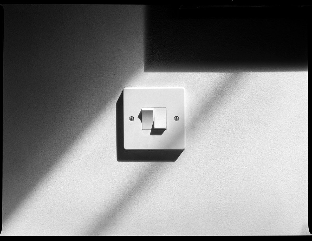 I have many beautiful prints from an Ilford negative. One Ilford film that always interests me is the Ortho 80. Being less sensitive in the reds it renders reds as dark or sometimes black giving interesting results. This is a print of a light switch in my home. The light was casting an interesting shadow across the wall. The black area is a shadow from a picture frame. It’s so simple but I just like the composition and various tones.
